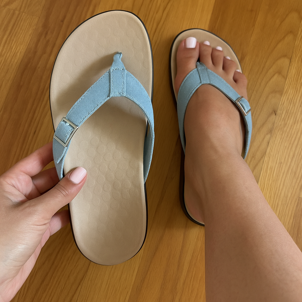 Arco del pie apoyado, talón acolchado, alineación de la espalda respetada. Alivia el dolor de pies y rodillas.